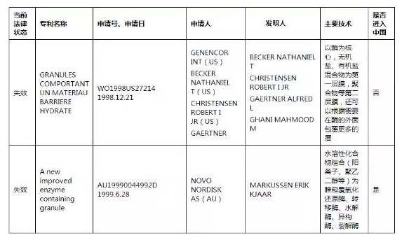 表1微囊化蛋白酶技术专利信息 表1中2件专利均是处于失效的专利,但是第二件专利在中国申请了专利,目前并处于有效状态,因此对于第二件专利所描述的技术内容,在中国无法使用。对于第一件专利所描述的技术内容,并且没有在中国申请专利,因此在中国,此件技术已是公知技术,可以使用,因此企业如果对此件专利所描述的技术感兴趣,即可进行研发生产。充分利用公知技术,降低研发成本,缩短研发时间。