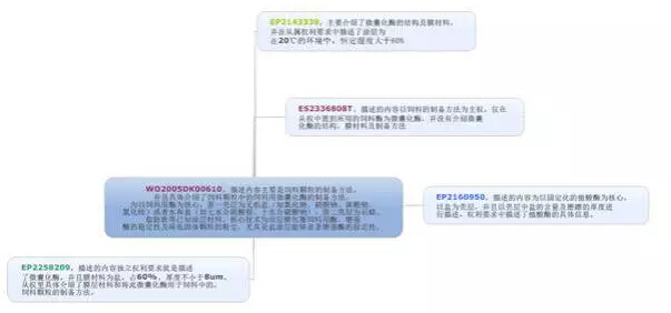 图7:WO2005DK00610饲料用微囊化酶的专利申请布局图 (2)专利申请技术布局:主要针对已有研发成果的技术,围绕此成果进行的专利申请布局,方式多样,常用的有扩散布局法、包围式布局法,产业链布局、特征替换布局等。