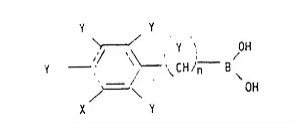 图4:间位取代芳基硼酸结构式 并揭示了芳基硼酸三位上的羟键基团(即上述结构式中的X)可与蛋白水解酶上的氨基酸之间通过氢键相连接,加强了抑制剂和蛋白酶之间的氢键,使得这种硼酸和蛋白酶特别强的结合在一起。